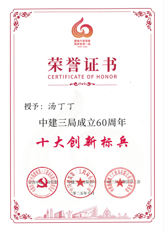 2025年10月30日,中建三局创新发展大会在汉召开,城乡水资源与水环境全国重点实验室-中建三局实验室副主任汤丁丁入选中建三局成立60周年“十大创新标兵”,获现场表彰。