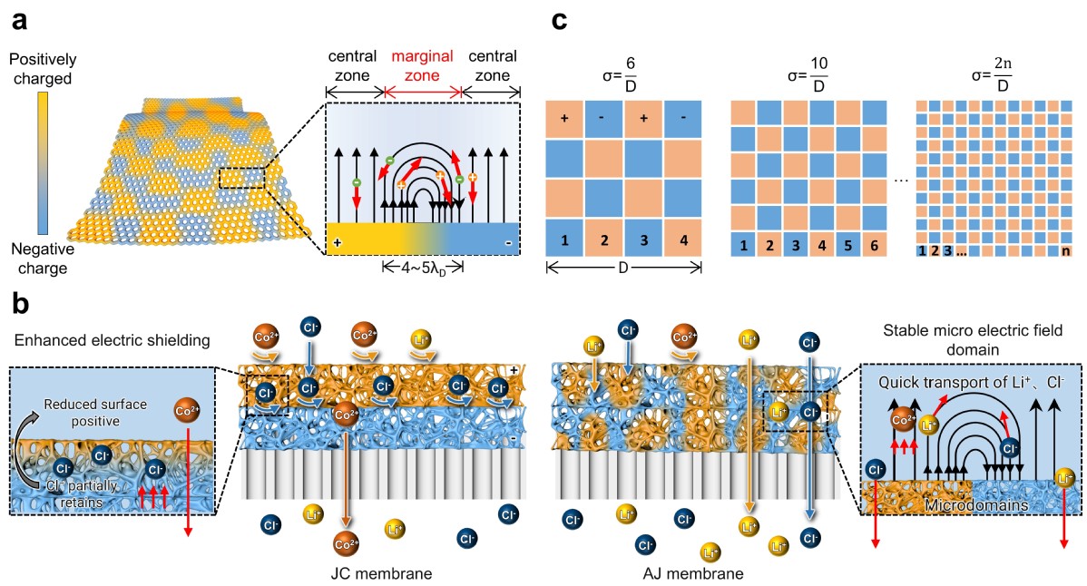 针对全球锂资源短缺问题,采用对锂离子具有高选择性分选的纳滤技术,有望实现锂电池废液中锂资源的经济、高效回收。然而,在锂回收过程中,常规的荷正电纳滤膜通常呈现出Janus电荷结构——即“表面为正电荷层-底面为负电荷层”(layer-by-layer)的特殊结构,会引起反离子在层间的过度积累,长周期运行过程中极易造成膜面正电荷层局部电场被抵消,导致钴、锰等二价离子穿透纳滤膜,进而使得锂离子的分离效能低下,即所谓的“静电屏蔽”效应。
