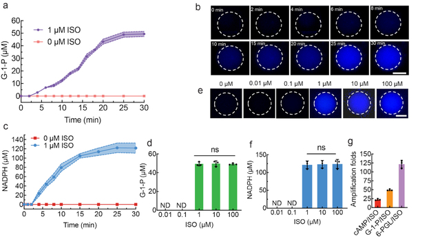 针对上述难题,团队在人造细胞中重组了β2-肾上腺素能受体(ADRB2)、Gs蛋白α亚基(Gsα)和腺苷酸环化酶V(ADCY5),构建了完整的信号转导通路。当胞外第一信使异丙肾上腺素(ISO)结合ADRB2后,Gsα被激活,进一步促使ADCY5产生第二信使环磷酸腺苷(cAMP)。cAMP随后激活蛋白激酶A(PKA),使下游糖原分解代谢所需的磷酸化酶激酶(PhK)和糖原磷酸化酶(PYGM)发生磷酸化级联反应,最终将糖原分解为葡萄糖-1-磷酸(G-1-P),并进一步在酶的作用下生成6-磷酸葡萄糖酸内酯和NADPH。在整个信号转导过程中,人造细胞呈现出从ISO到cAMP、G-1-P和6-磷酸葡萄糖酸内酯的阶梯式信号放大特征。该研究成果首次在人造细胞中实现了GPCR介导的完整信号转导与代谢调控,为开发具有自主感知、响应和调节能力的人造细胞奠定了坚实的基础。