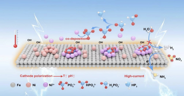 该研究展示了一种基于镍电镀废水的创新型资源化策略,通过在铁泡沫基底上直接电沉积制备磷酸镍催化剂。与以往在含次磷酸盐体系中的电沉积研究不同,研究团队首次揭示了在高电流极化条件下,次磷酸盐可在阴极界面直接氧化生成磷酸盐,并阐释了其转化机制。优化获得的催化剂在酸性介质(pH 4.8)和低硝酸盐浓度(10 mM)条件下,对氨的法拉第效率高达96.6%。结合实验与理论方法,研究进一步阐明了该材料在硝酸盐还原反应中表现出的高活性以及对析氢反应的抑制特性。此外,通过系统探究电沉积电流密度、电化学活性面积和电化学阻抗之间的协同关系,建立了其与催化性能之间的有效关联。该研究为利用工业废水快速构筑高性能电催化剂提供了一条新颖的废物转化途径,同步推进了氮、磷、镍的资源回收与环境污染治理,有助于促进循环经济的发展。
