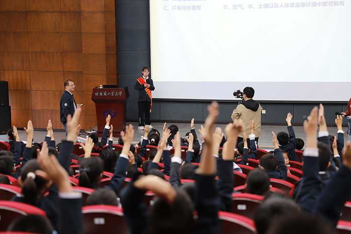 活动伊始,全体师生在报告厅集中聆听了主题为“生物与环境保护”的科普讲座。该讲座由哈尔滨工业大学环境学院李昂教授主讲,他围绕微生物与水处理、微生物通讯与污水处理、微生物与抗生素、环境生物修复技术、重金属与生物、微生物与大气污染、生物与固体废物等方面,进行了深入浅出的讲解,帮助同学们理解生物与环境保护的紧密关联,引导大家树立节约资源、保护环境的理念。互动提问环节将活动推向高潮,同学们热情高涨、踊跃举手,积极分享自己的疑问与思考。